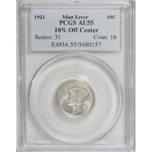 <B>1921 10C Mercury Dime--10% Off Center--AU55 PCGS.</B></I> Any off center Mercury dime would be of interest, but this is a 1921, a semikey with the lowest Philadelphia Mint emission. Certainly a stopper in an off-center date collection. Moderately off center toward 5 o'clock. The lower obverse has several thin marks, particularly near the rim. Struck from boldly clashed dies.<BR><I>From The Vanek Collection.</B></I><BR><BR><b>Shipping:</b> Coins & Currency (<a target="_blank" href="http://www.heritageauctions.com/common/shipping.php">view shipping information</a>)