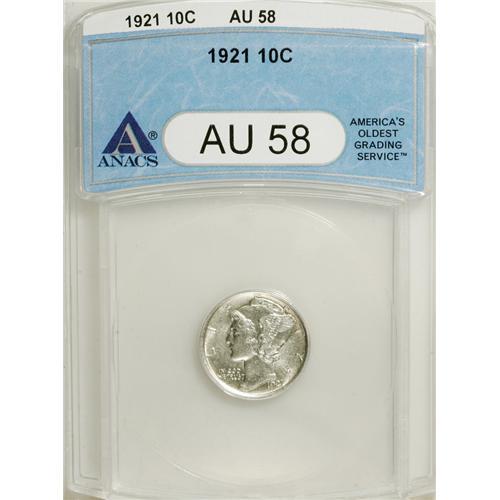<B>1921 10C AU58 ANACS.</B></I> Strongly lustrous with just a touch of highpoint friction. The overall definition is bold, and on the reverse, the bands approach complete separation. A largely untoned and lovely representative of this desirable semi-key issue.<BR><BR><b>Shipping:</b> Coins & Currency (<a target="_blank" href="http://www.heritageauctions.com/common/shipping.php">view shipping information</a>)