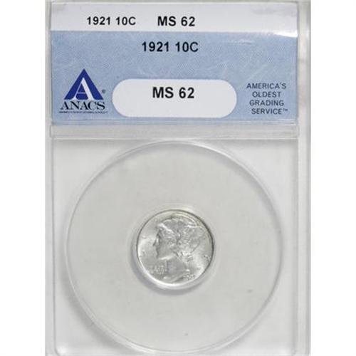 <B>1921 10C MS62 ANACS.</B></I> This issue had a low mintage of 1.230,000 pieces. Well struck, lustrous, and untoned, with minimal marks for the grade. A great example of this important semi-key date. <BR><BR><B>Coin Engraver:</B> Adolph A. Weinman<BR><BR><b>Shipping:</b> Coins & Currency (<a target="_blank" href="http://www.heritageauctions.com/common/shipping.php">view shipping information</a>)