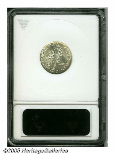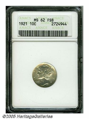 <B>1921<10C> MS62 Full Bands ANACS.</B></I> This key date Mercury displays touches of light tan color over bright silvery surfaces. The motifs are sharply struck, befitting the full bands designation. A few minute marks are located on the bottom of Mercury's neck and on the fasces.