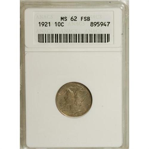 <B>1921 10C MS62 Full Bands ANACS.</B></I> The lustrous surfaces of this solidly struck example host an alluring blend of peach, rose, and amethyst patina. Light, scattered abrasions define the grade, though the eye appeal is better than the numeric designation might suggest.<BR><BR><B>Coin Engraver:</B> Adolph A. Weinman<BR><BR><b>Shipping:</b> Coins & Currency (<a target="_blank" href="http://www.heritageauctions.com/common/shipping.php">view shipping information</a>)