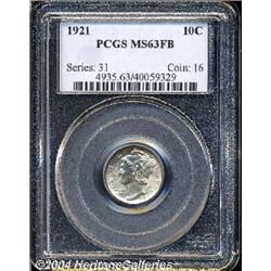 <B>1921<10C> MS63 Full Bands PCGS.</B></I> This popular date in the Mercury dime series has satiny, lightly toned surfaces. Well defined throughout, a couple of minor marks serve to limit the grade. <BR><BR><B>Important notice:</B> Heritage usually auctions material at the rate of 200-250 lots per hour. On some occasions eBay Live bid software or the Internet may not be able to keep up with the pace of the auction. We recommend placing a realistic absentee bid now as insurance to avoid disappointment. Occasionally the auctioneer may eliminate or reject an eBay Live bid, and the auctioneer may also reopen a lot after the close of the eBay live bidding (usually because we missed an audience bid), and may reject your bid even if it shows you as the winning bidder. By bidding via eBay Live, you agree that Heritage may award the lot to another bidder at its sole discretion under the circumstances described above or any other reasonable circumstances. Since eBay bids are not shown to us until we open the lot on the floor, we treat those bids just like floor bids. In most cases the floor responds before the eBay bid is presented to us, due to Internet lag time, so for consistency we have made it a policy that floor bids are always considered first over tie eBay live bids. Also please note that all Heritage lots purchased through eBay Live carry a 20% Buyer's Premium. Please make sure you read the Terms and Conditions before you bid.