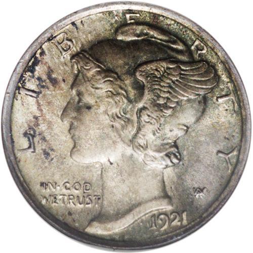 <B>1921 10C MS64 Full Bands NGC.</B></I> A bold striking overlaid in deep, natural shades of steel-gray and golden toning. As with many Uncirculated examples of this key Philadelphia issue, there is noticeable "fadeaway" on the final two digits of the date.