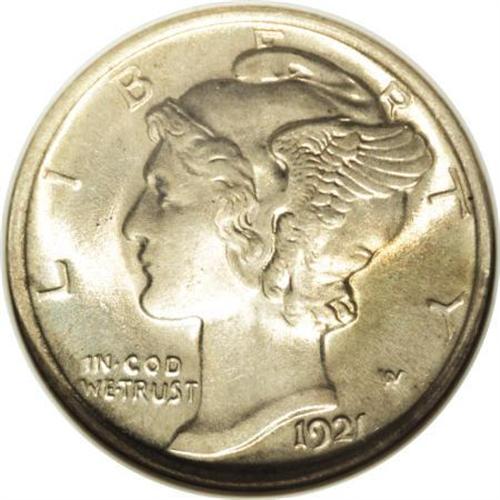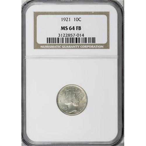 <B>1921 10C MS64 Full Bands NGC.</B></I> Dusky chestnut-gold toning enriches this lustrous and crisply struck near-Gem. Both sides are surprisingly unabraded. The obverse field has a slight orange-peel texture from a long-in-use die. The reverse has a trio of rim cuds near 4 o'clock. The key to a date set of Mercury dimes, due to a low mintage of 1.23 million pieces.<BR><BR><B>Coin Engraver:</B> Adolph A. Weinman<BR><BR><b>Shipping:</b> Coins & Currency (<a target="_blank" href="http://www.heritageauctions.com/common/shipping.php">view shipping information</a>)