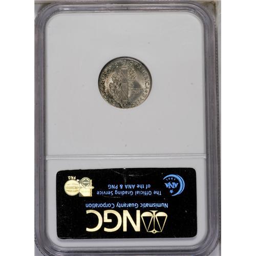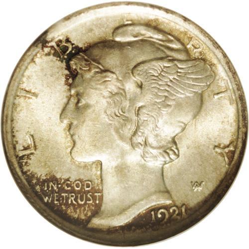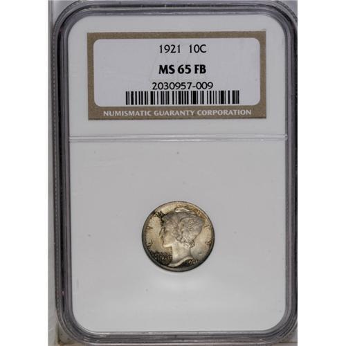 <B>1921<10C> MS65 Full Bands NGC.</B></I> Always a popular issue in the Mercury dime series as only 1.23 million pieces were struck. Worth a premium in all grades, the 1921 is especially scarce and desirable in the better states of Uncirculated. This is an original coin that has medium gray patina over each side with deep russet patina around the peripheral legends on each side. Strong underlying mint luster. Census: 51 in 65, 20 finer (5/06).