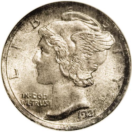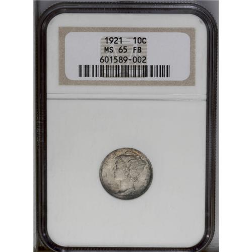 <B>1921<10C> MS65 Full Bands NGC.</B></I> The 1.23 million dimes struck in Philadelphia in 1921 were all struck in the first half of the year and these were the last dimes struck until 1923. This issue is usually found in VG and lesser grades. Gems are rare and eagerly sought out by advanced collectors. This is a lovely example whose softly frosted mint luster is covered by an even layer of gray-rose patina on each side. Strongly struck throughout with better definition on the peripheral lettering than usually seen. Census: 52 in 65, 22 finer (9/06).