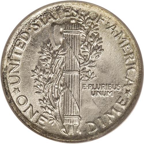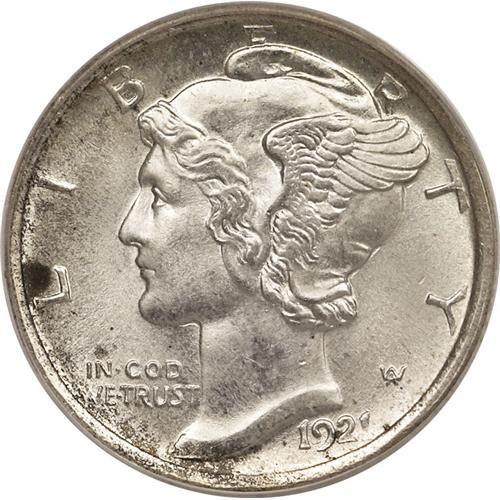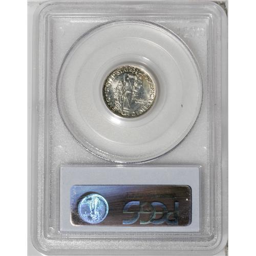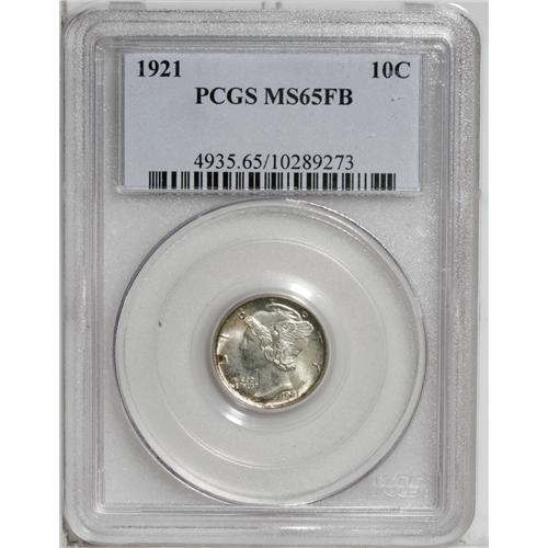 <B>1921<10C> MS65 Full Bands PCGS.</B></I> An attractive Gem example of this scarce and always-needed key issue. The mint luster is bright beneath the faint overlay of color and there are no objectionable marks on either side. One dark toning spot is seen at 9 o'clock on the obverse rim.