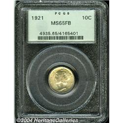 <B>1921<10C> MS65 Full Bands PCGS.</B></I> The 1921 Dime is a popular, low mintage issue with only 1.23 million pieces produced. While it is relatively available in lower circulated grades, the 1921 is quite difficult in Gem condition, and worth a significant premium with Full Bands. The surfaces on this piece are smooth with soft, frosted mint luster. Faintly toned throughout, a coin worthy of a close look and a premium bid. <BR><BR><B>Important notice:</B> Heritage usually auctions material at the rate of 200-250 lots per hour. On some occasions eBay Live bid software or the Internet may not be able to keep up with the pace of the auction. We recommend placing a realistic absentee bid now as insurance to avoid disappointment. Occasionally the auctioneer may eliminate or reject an eBay Live bid, and the auctioneer may also reopen a lot after the close of the eBay live bidding (usually because we missed an audience bid), and may reject your bid even if it shows you as the winning bidder. By bidding via eBay Live, you agree that Heritage may award the lot to another bidder at its sole discretion under the circumstances described above or any other reasonable circumstances. Since eBay bids are not shown to us until we open the lot on the floor, we treat those bids just like floor bids. In most cases the floor responds before the eBay bid is presented to us, due to Internet lag time, so for consistency we have made it a policy that floor bids are always considered first over tie eBay live bids. Also please note that all Heritage lots purchased through eBay Live carry a 20% Buyer's Premium. Please make sure you read the Terms and Conditions before you bid.