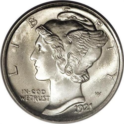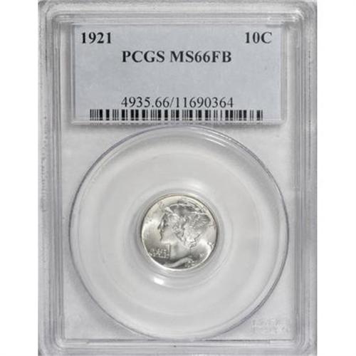 <B>1921 10C MS66 Full Bands PCGS.</B></I> The 1921 is well known as the scarcest Philadelphia Mint issue, due to its early date and a mintage of only 1.23 million pieces. This lustrous and nearly brilliant Premium Gem has smooth surfaces and excellent eye appeal. Portions of the obverse field are mildly prooflike, as made. Population: 35 in 66, 2 finer (6/07).<BR><I>From The Belle Glade Collection, Part Two.</B></I><BR><BR><B>Coin Engraver:</B> Adolph A. Weinman<BR><BR><b>Shipping:</b> Coins & Currency (<a target="_blank" href="http://www.heritageauctions.com/common/shipping.php">view shipping information</a>\)