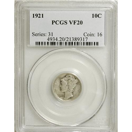 <B>1921 10C VF20 PCGS.</B></I> PCGS Population (19/192). NGC Census: (75/397). Mintage: 1,230,000. Numismedia Wsl. Price for NGC/PCGS coin in VF20: $221. (#4934)<BR><BR><b>Shipping:</b> Coins & Currency (<a target="_blank" href="http://www.heritageauctions.com/common/shipping.php">view shipping information</a>)