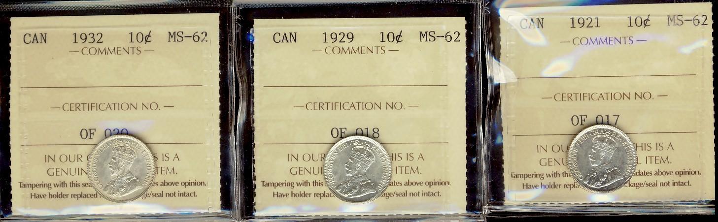 1921, 1929, 1932 10¢ all ICCS MS62, Lot of 3 coins,