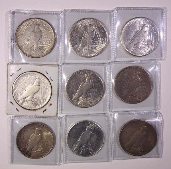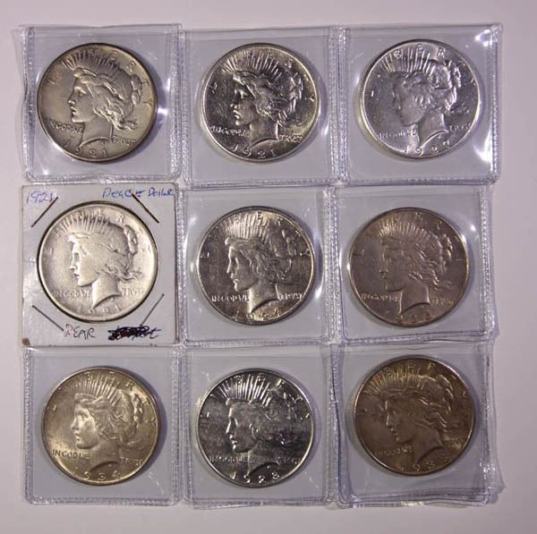 1921/1935-S Peace Dollars, better selection. About Good to About Uncirculated. Of nine in total: 19213; 1924-S; 1927; 1928-S; 1934-D; 1935, 1935-S. AG 1921 with obverse and reverse graffiti. Examination a must.