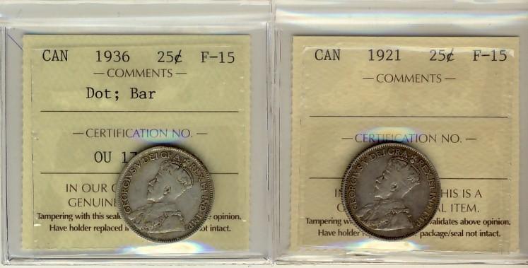 1921 & 1936 Dot / Bar 25¢ ICCS F15. Lot of 2 coins.