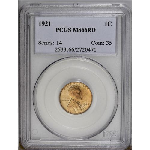 <B>1921<1C> MS66 Red PCGS.</B></I> A blazing Red coin that boasts attractive surfaces and a trace of carbon. The strike is sharp on the motto and wheat ears, without the often seen drawn lettering toward the rim. A scarcer date and this one has adequate eye appeal for the grade. Population: 59 in 66, 10 finer (3/06).<BR><I>From The Kendall Marie #4 All-Time Finest PCGS Registry of Lincoln Cents with Varieties, Circulation Strikes, 1909-1958.</B></I> <BR><BR><B>Important notice:</B> Heritage usually auctions material at the rate of 200-250 lots per hour. On some occasions eBay Live bid software or the Internet may not be able to keep up with the pace of the auction. We recommend placing a realistic absentee bid now as insurance to avoid disappointment. Occasionally the auctioneer may eliminate or reject an eBay Live bid, and the auctioneer may also reopen a lot after the close of the eBay live bidding (usually because we missed an audience bid), and may reject your bid even if it shows you as the winning bidder. By bidding via eBay Live, you agree that Heritage may award the lot to another bidder at its sole discretion under the circumstances described above or any other reasonable circumstances. Since eBay bids are not shown to us until we open the lot on the floor, we treat those bids just like floor bids. In most cases the floor responds before the eBay bid is presented to us, due to Internet lag time, so for consistency we have made it a policy that floor bids are always considered first over tie eBay live bids. Also please note that all Heritage lots purchased through eBay Live carry a 20% Buyer's Premium. Please make sure you read the Terms and Conditions before you bid. This lot is being auctioned in conjunction with a live floor auction by Heritage Galleries & Auctioneers. All final auction and invoice information will be supplied by Heritage Galleries & Auctioneers, and all other information should be considered preliminary. Lot:503 <BR><BR><B>Winning Notification and Billing:</B> After the FINAL session in this auction is complete, Heritage will send e-mail and snail mail invoices. This process normally takes several days. All final auction and invoice information will be supplied by Heritage Galleries & Auctioneers, and all other information should be considered preliminary. <BR><BR>This auction will be conducted on a live auction floor and over the Internet through eBay Live. If you choose to place an absentee bid, please take a moment to <font color='#0000ff'><u><a href='http://pages.ebay.com/liveauctions/help/before/laabsentee.html'>learn how eBay Live absentee bidding works</a></u></font><font color='#000000'>