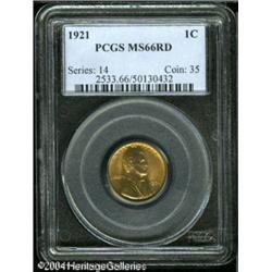 1921 1C MS66 Red PCGS. An outstanding example of t <B>1921 1C MS66 Red PCGS.</B></I> An outstanding example of this condition challenged date in upper grades. This coin displays a satiny orange-red glow, with sharpness of detail to the beard and other fine points. A high quality early date Lincoln Cent. Population: 63 in 66, 10 finer (10/04). <BR><BR><B>Important notice:</B> Heritage usually auctions material at the rate of 200-250 lots per hour. On some occasions eBay Live bid software or the Internet may not be able to keep up with the pace of the auction. We recommend placing a realistic absentee bid now as insurance to avoid disappointment. Occasionally the auctioneer may eliminate or reject an eBay Live bid, and the auctioneer may also reopen a lot after the close of the eBay live bidding (usually because we missed an audience bid), and may reject your bid even if it shows you as the winning bidder. By bidding via eBay Live, you agree that Heritage may award the lot to another bidder at its sole discretion under the circumstances described above or any other reasonable circumstances. Since eBay bids are not shown to us until we open the lot on the floor, we treat those bids just like floor bids. In most cases the floor responds before the eBay bid is presented to us, due to Internet lag time, so for consistency we have made it a policy that floor bids are always considered first over tie eBay live bids. Also please note that all Heritage lots purchased through eBay Live carry a 20% Buyer's Premium. Please make sure you read the Terms and Conditions before you bid. This lot is being auctioned in conjunction with a live floor auction by Heritage Galleries & Auctioneers. All final auction and invoice information will be supplied by Heritage Galleries & Auctioneers, and all other information should be considered preliminary. Lot:5286