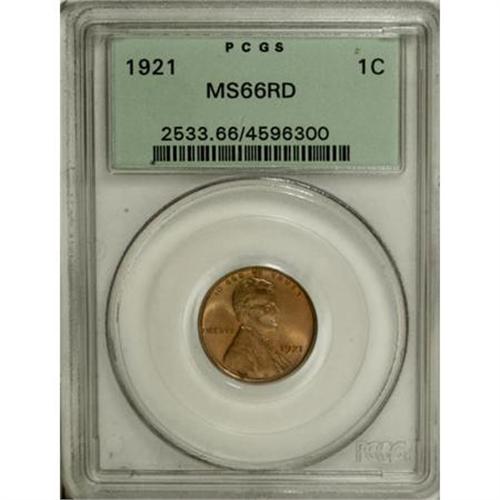 <B>1921 1C MS66 Red PCGS.</B></I> This orange and yellow-gold Premium Gem has potent luster and a meticulous strike. The reverse has occasional pinpoint flecks. Certified in a green label holder. Population: 59 in 66 Red, 11 finer (1/08).<BR><BR><B>Coin Engraver:</B> Victor D. Brenner<BR><BR><b>Shipping:</b> Coins & Currency (<a target="_blank" href="http://www.heritageauctions.com/common/shipping.php">view shipping information</a>)