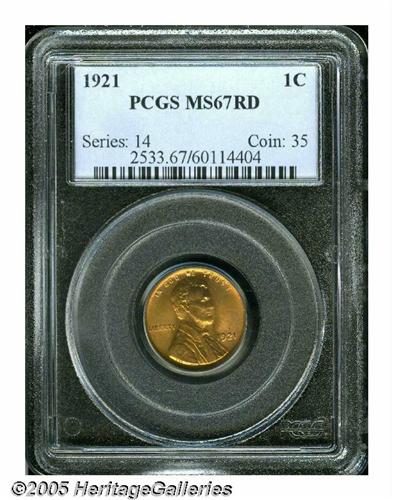 <B>1921<1C> MS67 Red PCGS.</B></I> A liberally frosted Superb Gem with tinges of orange iridescence about the peripheries. Although far fewer 1921 Lincolns were produced than in the previous few years, the challenge in locating a coin of this grade lies with the finicky nature of the metal itself. Always susceptible to fading, spotting, etc., this impeccable, fiery example somehow managed to escape the normal pitfalls of copper coinage. Population: 8 in 67, 2 finer (6/05).<BR><I>From The William Bickel Collection, Part One.</B></I>