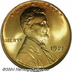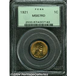 <B>1921<1C> MS67 Red PCGS.</B></I> A remarkably preserved and extremely well struck example of this issue, this piece exhibits fantastic orange-red color over much of the obverse with most of the reverse being a lighter shade of copper-red. Brilliant shimmering luster blasts at you with attention-getting intensity. All but mark and spot-free, this coin belongs to those who aspire to collect only the best of early Lincoln Cents. Population: 8 in 67, 2 finer (9/04). <BR><BR><B>Important notice:</B> Heritage usually auctions material at the rate of 200-250 lots per hour. On some occasions eBay Live bid software or the Internet may not be able to keep up with the pace of the auction. We recommend placing a realistic absentee bid now as insurance to avoid disappointment. Occasionally the auctioneer may eliminate or reject an eBay Live bid, and the auctioneer may also reopen a lot after the close of the eBay live bidding (usually because we missed an audience bid), and may reject your bid even if it shows you as the winning bidder. By bidding via eBay Live, you agree that Heritage may award the lot to another bidder at its sole discretion under the circumstances described above or any other reasonable circumstances. Since eBay bids are not shown to us until we open the lot on the floor, we treat those bids just like floor bids. In most cases the floor responds before the eBay bid is presented to us, due to Internet lag time, so for consistency we have made it a policy that floor bids are always considered first over tie eBay live bids. Also please note that all Heritage lots purchased through eBay Live carry a 20% Buyer's Premium. Please make sure you read the Terms and Conditions before you bid.