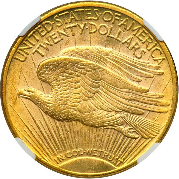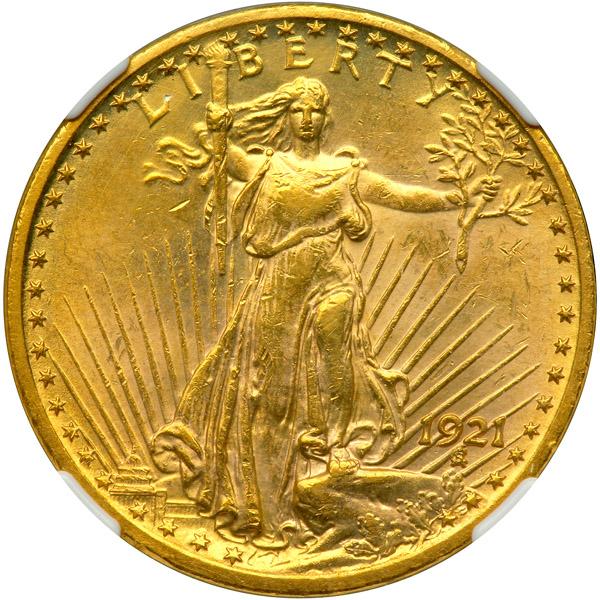 1921 $20 St. Gaudens. NGC graded MS-61. Lovely golden toning. A popular key date. Frosty Mint quality and just shy of the Choice category. This bold example of the rare 1921 issue has full bright yellow-gold luster with a normal wisp of pinkish red to enhance the coin, the luster illustrating the memorable cartwheel display. A few scattered marks are to be found on the obverse, while the reverse boasts a suitable satin-like and more mark-free surface. We note a faint line in the color at the eagle's beak. A mintage of 528,500 pieces would seem to make the 1921 a fairly affordable issue compared to similar-mintage years in the series; one thing differentiates it, however, the coin was produced in the depths of a short, sharp post-World War I business depression. Like other dates in the series, much of this issue was stored in banks, at the Federal Reserve, or in U.S. Treasury vaults. Presumably these met the same fate in 1933-37 as so many millions of other $20 gold pieces, they were melted.