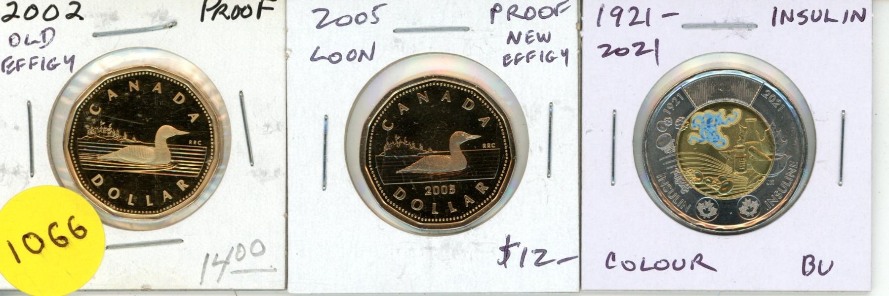 1921 – 2021 Colourized Insulin $2 Toonie. Commemorates Doctors Banting & Best discovering Insulin. BU, 2023 Jean Riopelle $2 Toonie. Colourized. BU and 2023 Indigenous Peoples Day $2 Toonie. BU.