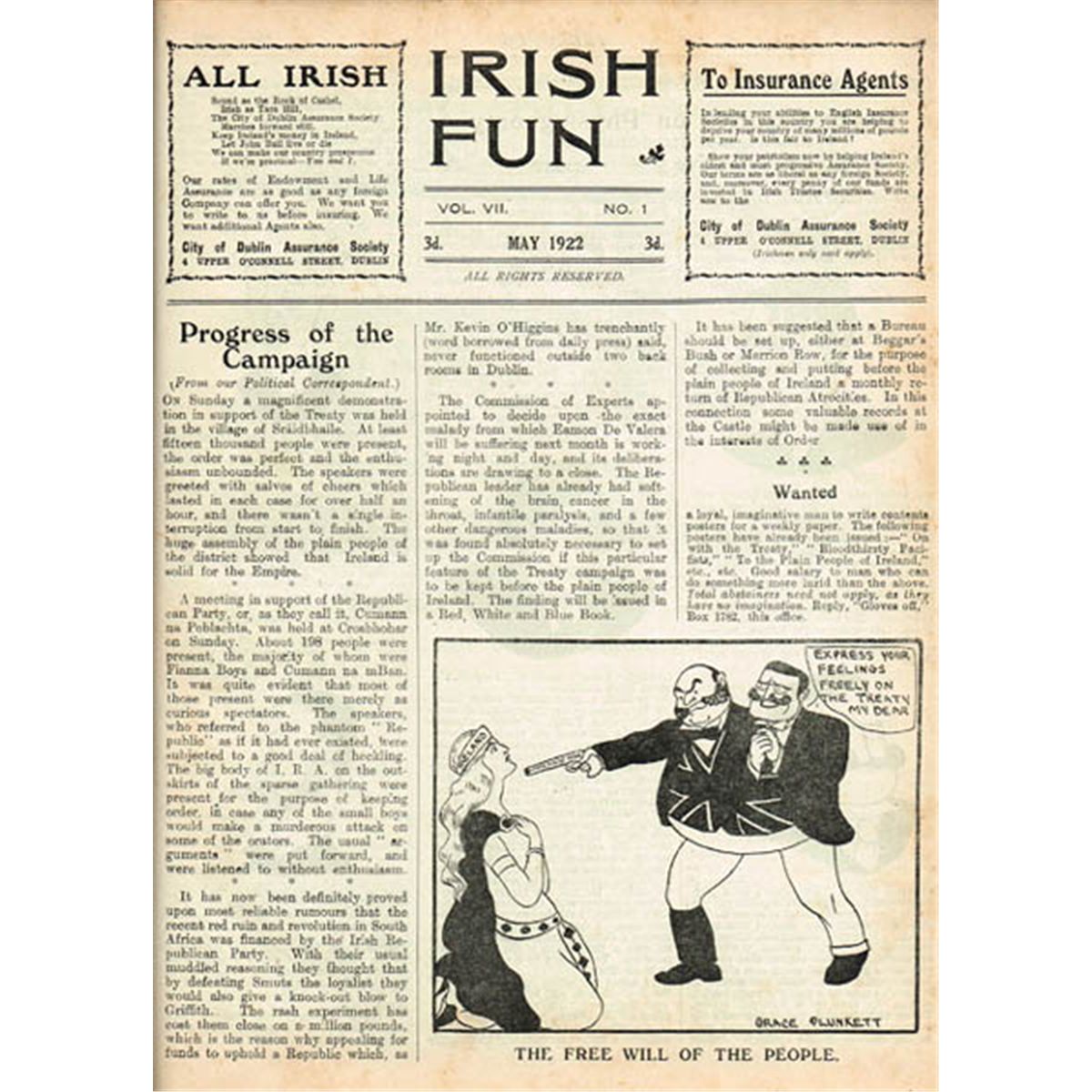 An unbroken collection from Vol. VI no. 2 (June 1921) to Vol. X no. 120 (August 1925). A monthly publication with satirical political commentary, cartoons, poems etc. Contributors include Brian O'Higgins, Cathal O'Byrne, Donn Piatt, Liam Mellows, Austin Stack, Kevin O'Higgins etc. With political cartoons by Grace Plunkett.