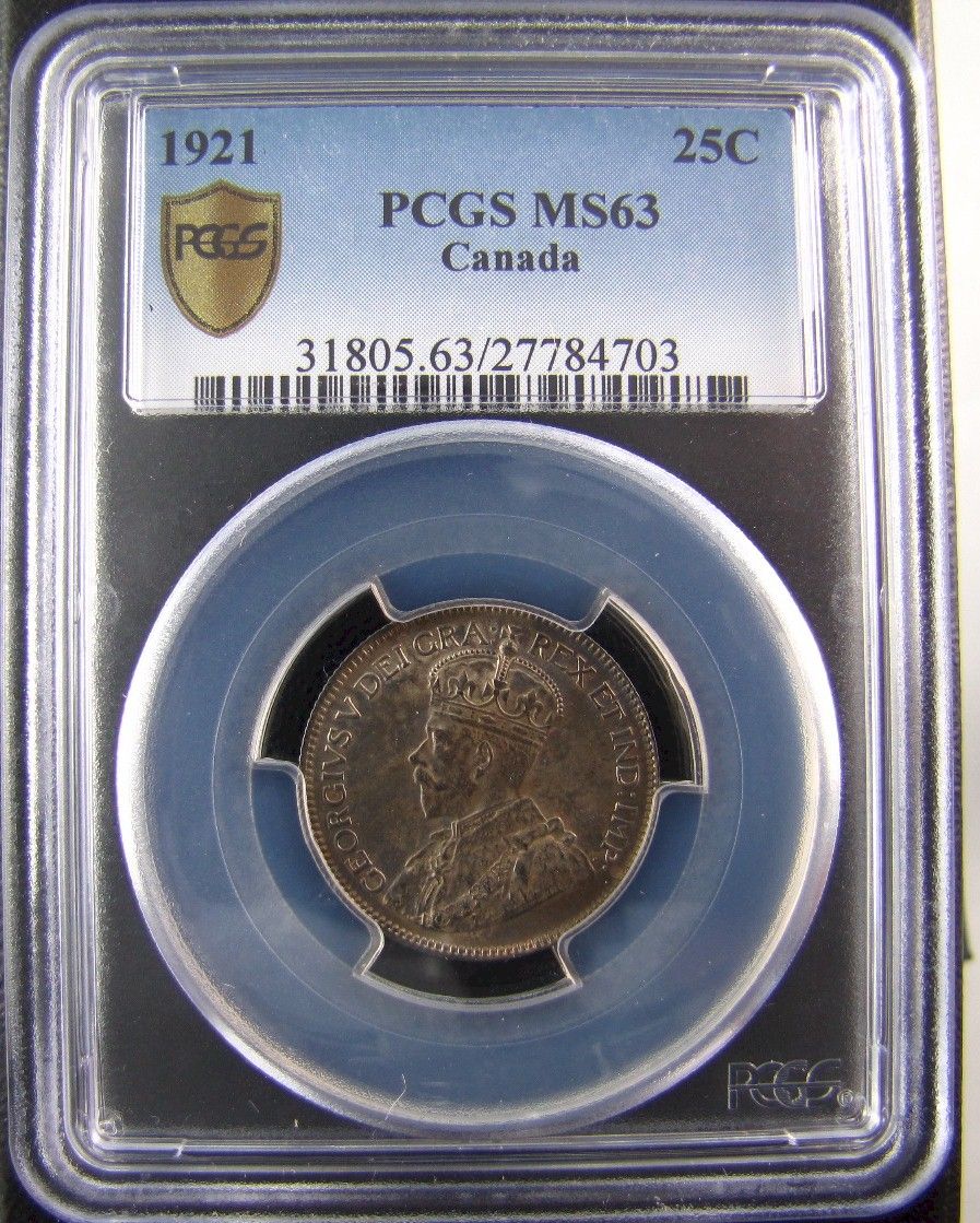 1921 25¢ PCGS MS63, scarce date in choice Uncirculated. Lightly toned.