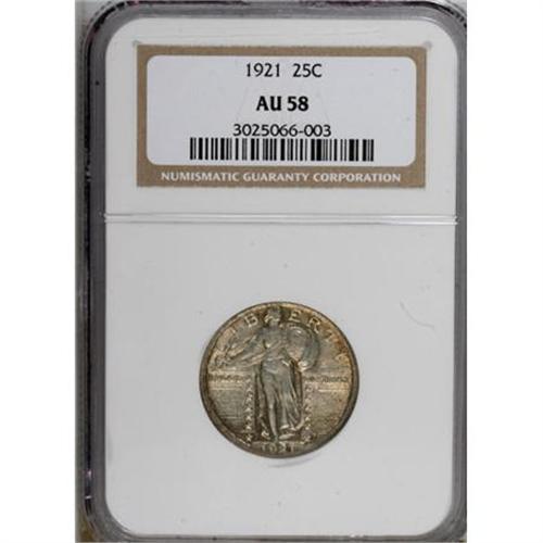 <B>1921 25C AU58 NGC.</B></I> This still-lustrous, attractively toned piece hails from a mintage of under 2 million pieces. The obverse is predominantly silver-gray with orange toning at the margins, while the reverse has richer peach patina. A modicum of highpoint friction precludes a Mint State designation.<BR><BR><B>Coin Engraver:</B> Hermon A. MacNeil<BR><BR><b>Shipping:</b> Coins & Currency (<a target="_blank" href="http://www.heritageauctions.com/common/shipping.php">view shipping information</a>)