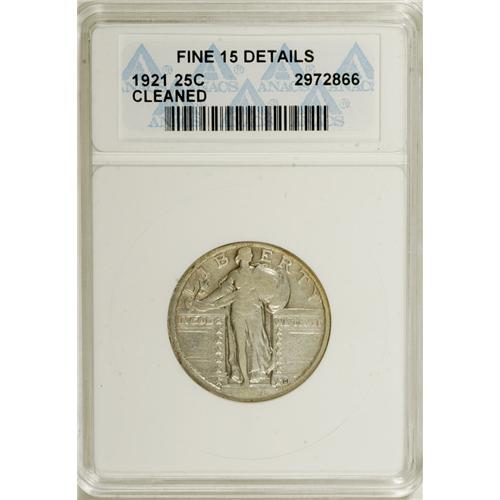 <B>1921 25C --Cleaned--ANACS. Fine 15 Details.</B></I> NGC Census: (32/828). PCGS Population (16/575). Mintage: 1,916,000. Numismedia Wsl. Price for NGC/PCGS coin in F15: $337. (#5740)<BR><BR><b>Shipping:</b> Coins & Currency (<a target="_blank" href="http://www.heritageauctions.com/common/shipping.php">view shipping information</a>)