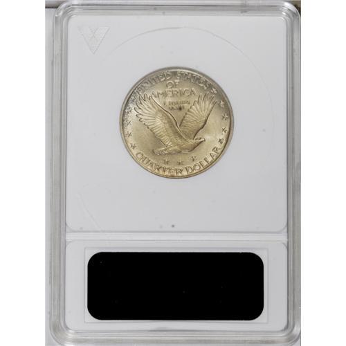 <B>1921<25C>--Cleaned--ANACS. MS60 Details.</B></I> No trace of wear, though the luster is unusually subdued for a Mint State piece of this issue. Toning ranges from yellow to orange, with a lone dark spot at the second U of UNUM.