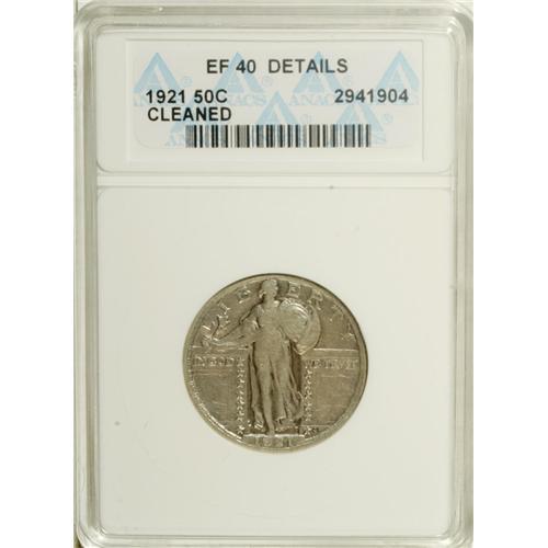 <B>1921 25C --Cleaned--ANACS. XF40 Details.</B></I> This low mintage issue is desirable in all grades, since many survivors have unrecognizable dates. A lightly cleaned pearl-gray example with ample detail on the eagle's front wing. ANACS has unaccountably encapsulated the piece as a 1921 half dollar.<BR><BR><b>Shipping:</b> Coins & Currency (<a target="_blank" href="http://www.heritageauctions.com/common/shipping.php">view shipping information</a>)