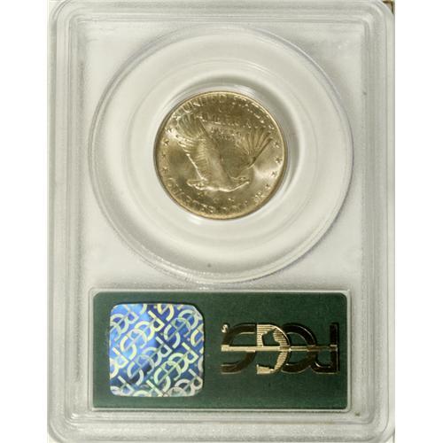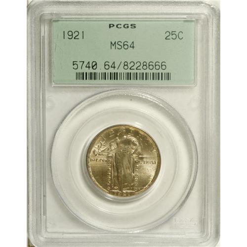 <B>1921 25C MS64 PCGS.</B></I> This low mintage quarter is gently toned in honey and ivory. Nicely struck on the shield and waist, although the date and head show softness. Well preserved aside from a solitary mark on the front wing. Encased in an old green label holder.<BR><BR><b>Shipping:</b> Coins & Currency (<a target="_blank" href="http://www.heritageauctions.com/common/shipping.php">view shipping information</a>)