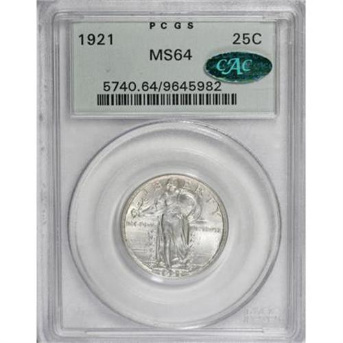 <B>1921 25C MS64 PCGS. CAC.</B></I> The 1921 is a low mintage issue, since the Philadelphia Mint concentrated on silver dollar production that year. Like all pre-1925 quarters, the date wore rapidly from circulated examples, making a full date 1921 pricey regardless of grade. This lustrous and lightly toned near-Gem has a suitable strike, and is clean aside from a thin mark near the left-side stars. Encapsulated in a green label holder.<BR><I>From The Parker Lee III Collection.</B></I><BR><BR><B>Coin Engraver:</B> Hermon A. MacNeil<BR><BR><b>Shipping:</b> Coins & Currency (<a target="_blank" href="http://www.heritageauctions.com/common/shipping.php">view shipping information</a>)