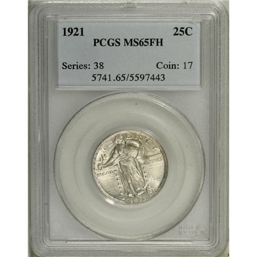 <B>1921 25C MS65 Full Head PCGS.</B></I> Just over 1.9 million pieces were struck of the 1921-P quarter, one of the lower production figures among Standing Liberty issues, and it is estimated that no more than 10 percent of the original mintage was produced with full details on Liberty's head. This is a splendid, no-questions Gem that is brilliant except for a light dusting of patina on the upper obverse. Fully detailed throughout with strong definition also on Liberty's shield and the eagle's plumage. Population: 42 in 65, 20 finer (12/06).<BR><BR><b>Shipping:</b> Coin/Currency (<a target="_blank" href="http://www.heritageauctions.com/common/shipping.php">view shipping information</a>)
