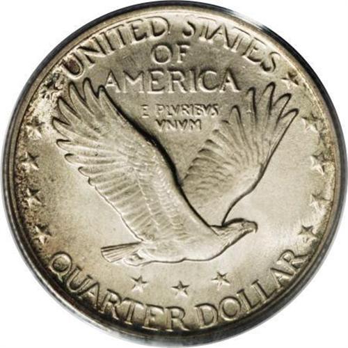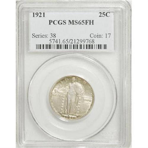 <B>1921 25C MS65 Full Head PCGS.</B></I> This is a key date issue that is seldom seen in any grade, let alone in Gem quality with crisp design features. This lovely coin has light coloration with appealing satin luster. Hints of sky-blue and speckled peripheral toning accents both sides. This example is extremely sharp with full head details, just as stated in the PCGS grade designation. Equally important is the central strike, with every shield rivet visible, although a couple of the lower ones are somewhat soft. Population: 48 in 65 Full Head, 20 finer (11/07). <BR><I>From The Hoffy Collection, NGC's #3 Registry Collection of Standing Liberty Quarters.</B></I><BR><BR><B>Coin Engraver:</B> Hermon A. MacNeil<BR><BR><b>Shipping:</b> Coins & Currency (<a target="_blank" href="http://www.heritageauctions.com/common/shipping.php">view shipping information</a>)
