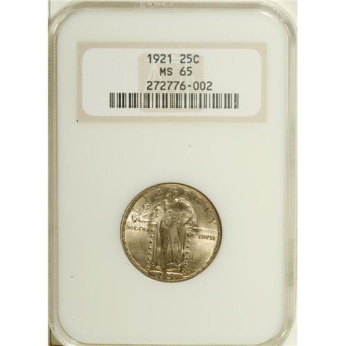 <B>1921 25C MS65 NGC.</B></I> Apricot-gray and powder-blue toning enlivens this lustrous and pleasing Gem. Well struck on the waist and shield, with moderate softness on the date and the top of the head. Certified in an older NGC holder.<BR><I>Ex: Detroit ANA Signature (Heritage, 7/94), lot 6553, which realized $990.</B></I><BR><BR><b>Shipping:</b> Coins & Currency (<a target="_blank" href="http://www.heritageauctions.com/common/shipping.php">view shipping information</a>)