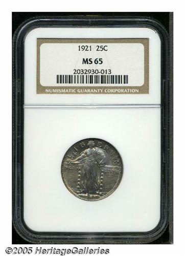 <B>1921<25C> MS65 NGC.</B></I> Lovely champagne-golden toning is splashed over both sides of this instantly attractive Gem. The mystique of the 1921 Dimes and Half Dollars carries over to the popularity of this lower mintage P-mint.<BR><I>From The Clifford Columbus Collection.</B></I>