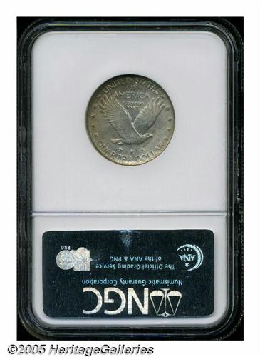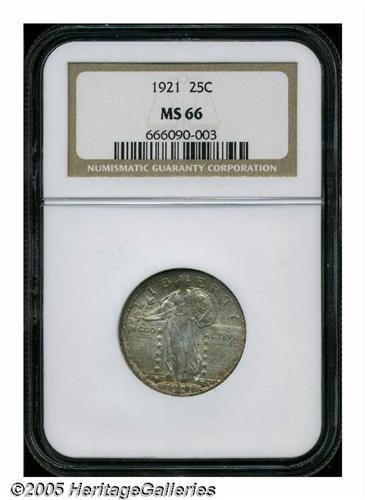 <B>1921<25C> MS66 NGC.</B></I> Rose-gray patina displays accents of sky-blue and violet. The lustrous surfaces are well preserved, being seemingly devoid of mentionable marks. The design elements are rather sharply struck. NGC and PCGS combined have certified 27 pieces at this grade level, and none finer (4/05).