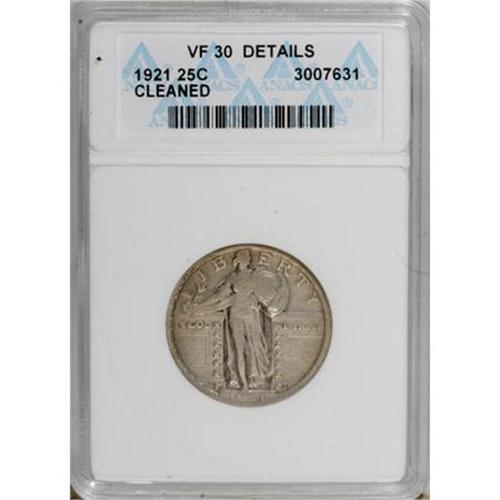 <B>1921 25C --Cleaned--ANACS. VF30 Details.</B></I> NGC Census: (11/362). PCGS Population (29/551). Mintage: 1,916,000. Numismedia Wsl. Price for NGC/PCGS coin in VF30: $446. (#5740)<BR><BR><B>Coin Engraver:</B> Hermon A. MacNeil<BR><BR><b>Shipping:</b> Coins & Currency (<a target="_blank" href="http://www.heritageauctions.com/common/shipping.php">view shipping information</a>)