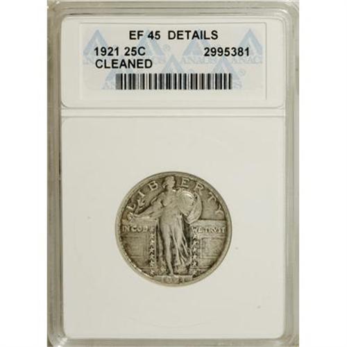 <B>1921 25C --Cleaned--ANACS. XF45 Details.</B></I> NGC Census: (18/329). PCGS Population (22/490). Mintage: 1,916,000. Numismedia Wsl. Price for NGC/PCGS coin in XF45: $512. (#5740)<BR><BR><B>Coin Engraver:</B> Hermon A. MacNeil<BR><BR><b>Shipping:</b> Coins & Currency (<a target="_blank" href="http://www.heritageauctions.com/common/shipping.php">view shipping information</a>\)
