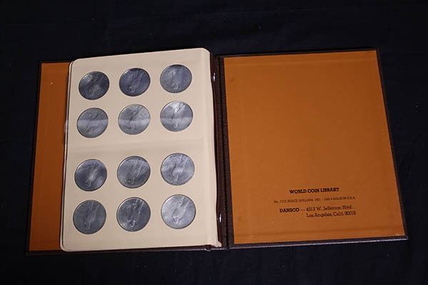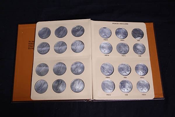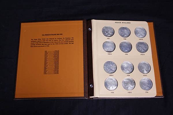 1921-35 Peace Dollar Complete Set. Very Good to About Uncirculated. Housed in the Brown folder as formed by an old time collector/hoarder in decent quality, painstakingly assembled over many decades, inspection invited.