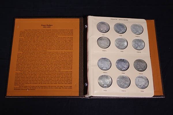 1921-35 Peace Dollar Complete Set. Very Good to About Uncirculated. Housed in the Brown folder as formed by an old time collector/hoarder in decent quality, painstakingly assembled over many decades, inspection invited.