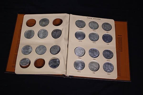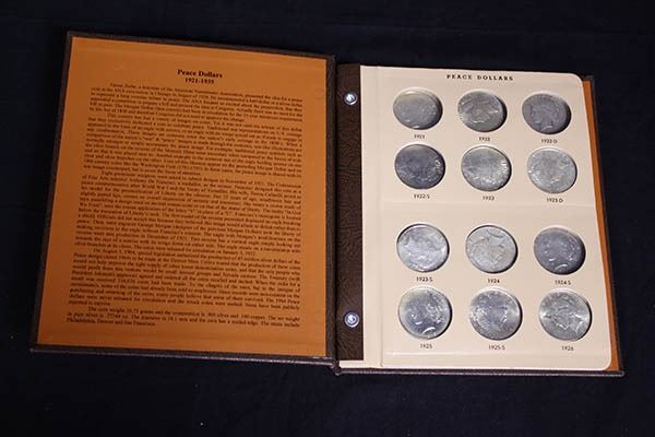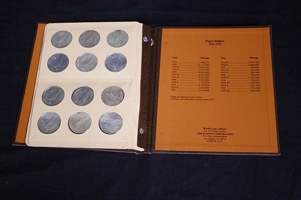 1921-35 Peace Dollar Complete Set. Very Good to About Uncirculated. Housed in the Brown folder as formed by an old time collector/hoarder in decent quality, painstakingly assembled over many decades, inspection invited.