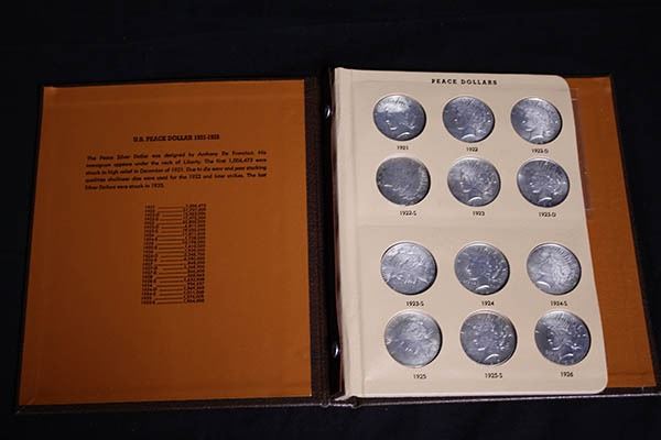 1921-35 Peace Dollar Complete Set. Very Good to About Uncirculated. Housed in the Brown folder as formed by an old time collector/hoarder in decent quality, painstakingly assembled over many decades, inspection invited.
