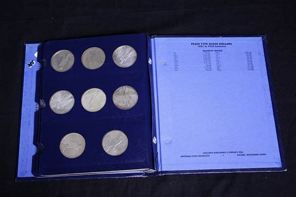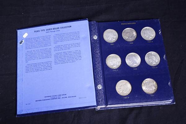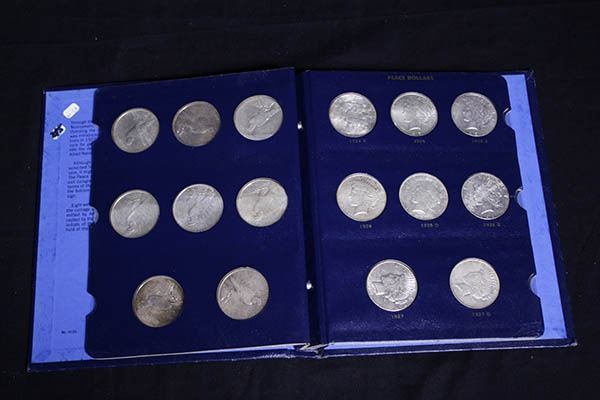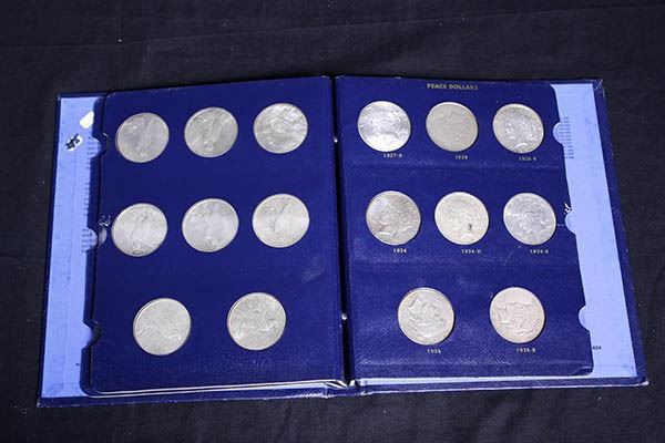 1921-35 Peace Dollar Complete Set. Very Good to About Uncirculated. Housed in the Blue folder as formed by an old time collector/hoarder in decent quality, painstakingly assembled over many decades, inspection invited.