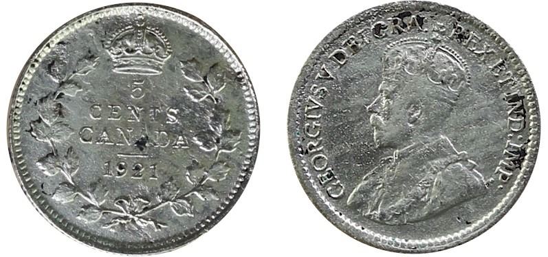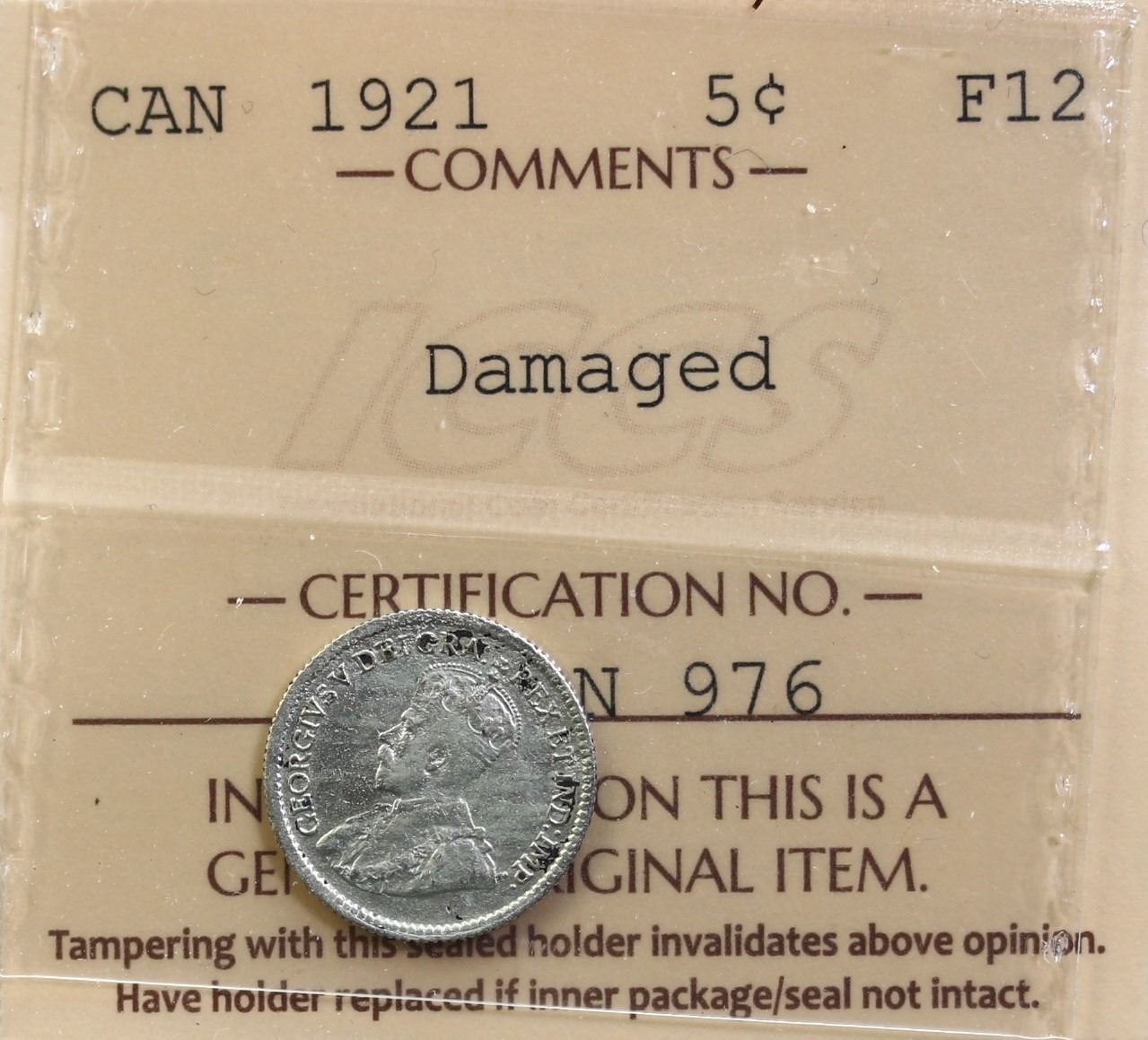 1921 5¢ ICCS Fine-12 with issues. "The Prince of Canadian Coins" Brilliant example with strong details on both sides. A very rare sought-after key date, not often found in these grades. Worth a premium bid.