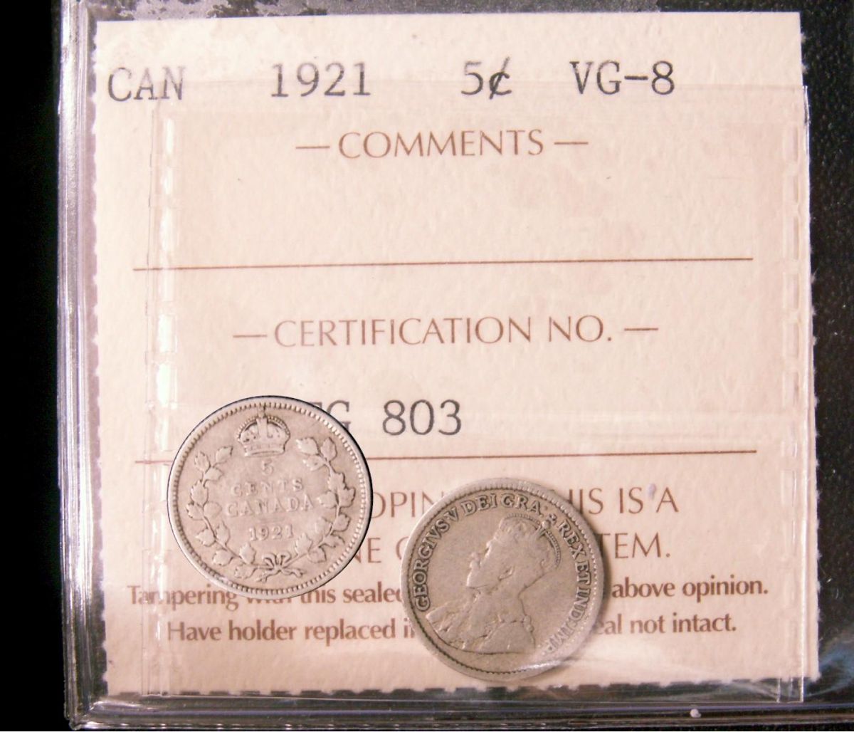 1921 5¢ ICCS VG8. Nice clean and well struck example. Original silver tone. A full VG example.