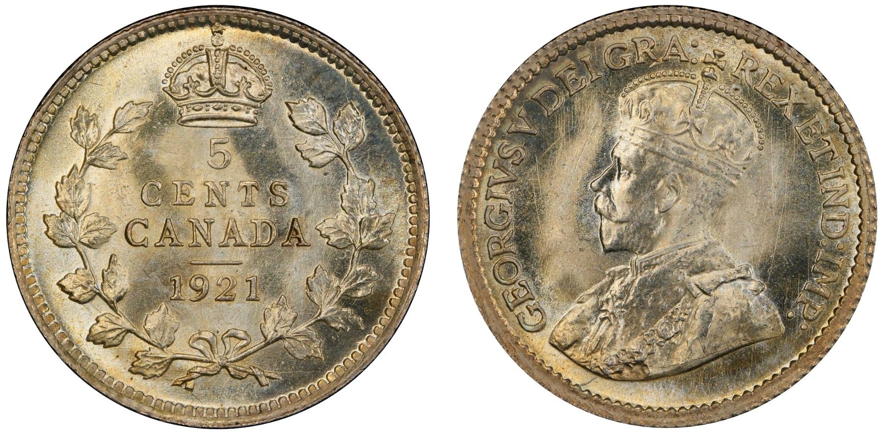 1921 5¢ PCGS Choice Mint State-65. The Prince of Canadian coins. This is a "Pristine" fully lustrous issue with delicate pink toning. A stunning and extremely eye catching key date example . Wow factor! Amongst the finest examples we have seen and handled in 40+ years. Don’t miss it, your dream could come true!