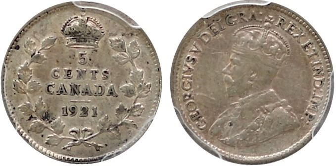 1921 5¢ PCGS Extra Fine-40 "The Prince of Canadian Coins" Brilliant and lustrous example. A very rare key date, not often found in these higher grades. Worth a premium bid.