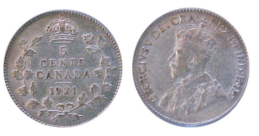 1921 5¢ PCGS XF45. Brilliant with some lustre. Scarce in this condition.