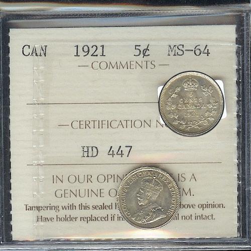 1921 5 cents in choice "Mint state" condition. 1921 ICCS MS-64. Attractively toned with light green, blue, silver gray and golden colours. . Of the highest rarity! For the serious and most advanced collectors. Worth a premium bid! Don't miss this "